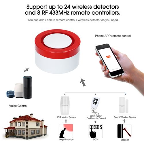 Compatible perfectly with Amazon Alexa for voice control. On-site 120DB high-decibel alarm, flashing lights and other alarm modes.