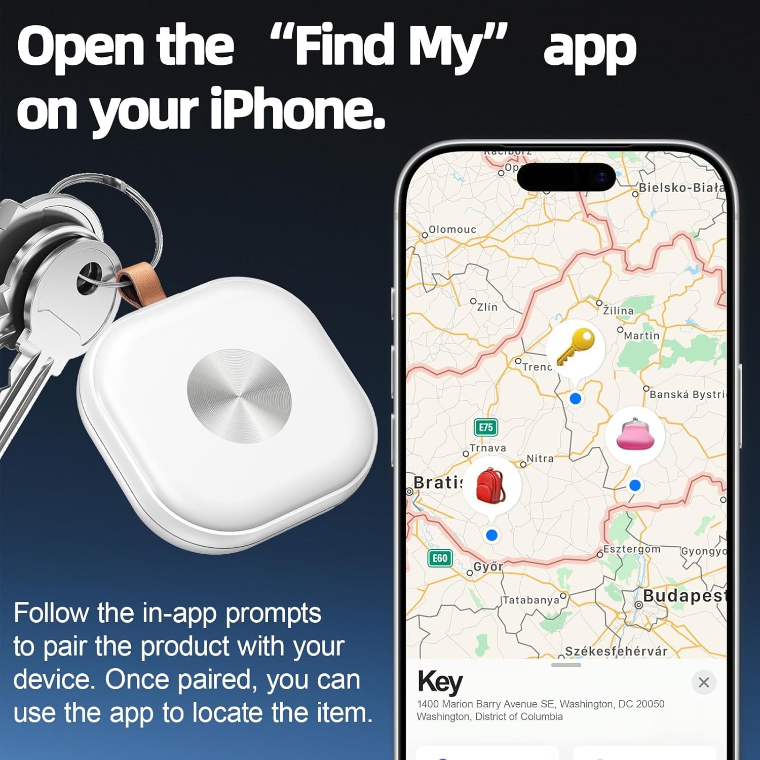 【Instantly Locate】Apple "Find My" compatible smart key finder with real-time location & sound. Within 590-1181 inch Bluetooth range, play 90-100dB sound via "Find My"; use map navigation for out-of-range tracking.